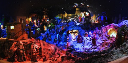 The scenes of this Nativity Crib represent the five Joyful Mysteries of the Holy Rosary. The scene of Angel Gabriel announcing the birth of Jesus to the Virgin Mary is displayed in the forefront from the left window, whereas in the background Our Lady is depicted meeting her cousin Elizabeth. Through the main window in the centre, one can admire the graceful scene of the birth of Jesus in a grotto at Bethlehem, while the three Wise Men and several shepherds adore the newly born Divine Child. The third window opens upon the scene of the presentation of the Child Jesus in the Temple at Jerusalem. Finally, Joseph and Mary holding her child in her arms, are depicted fleeing to Egypt on a donkey.