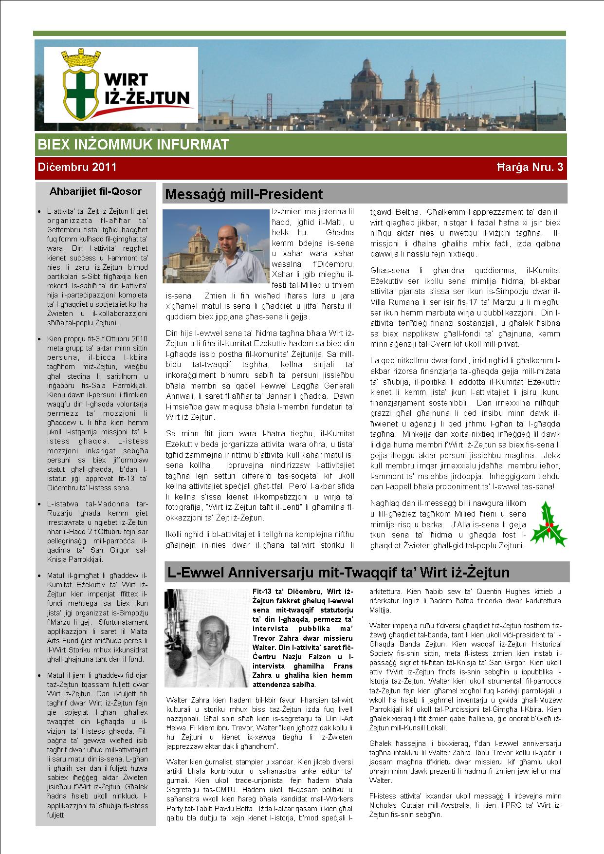 In this issue, besides the usual news corner on the front page, one finds a message written by Wirt iż-Żejtun President, Perit Ruben Abela. In his message, Perit Abela, looks back at the active year which Wirt iż-Żejtun had. The front page also includes a short review about the latest activity which the organisation had, portraying Walter Zahra through a public interview with his son, Trevor.