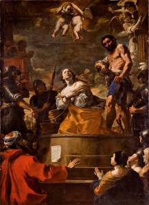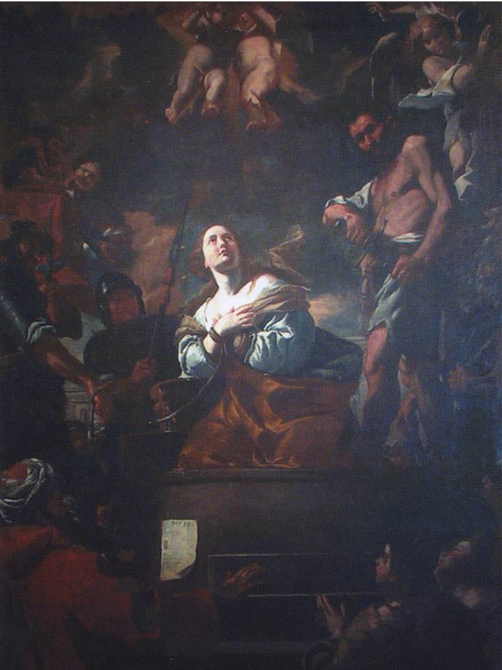 The painting is a copy of another which is of greater artistic value since it is the work of Mattia Preti. Preti’s painting is found at the church of Santa Caterina d’Italia, in Valletta. This painting depicts the saint looking calmly upwards with the executioner drawing out the sword to behead the saint.
