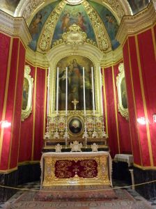 The titular altarpiece is probably the work of Bormla-born Rocco Buhagiar (1725-1805) although some attribute this painting to Francesco Zahra.