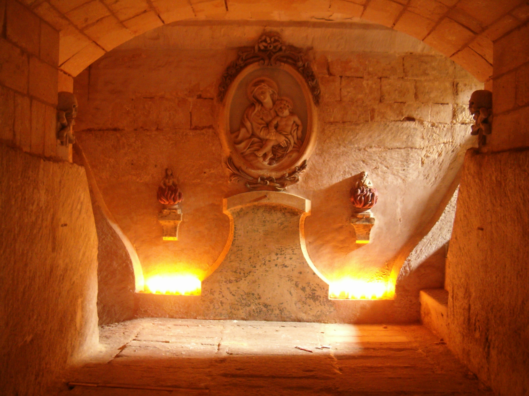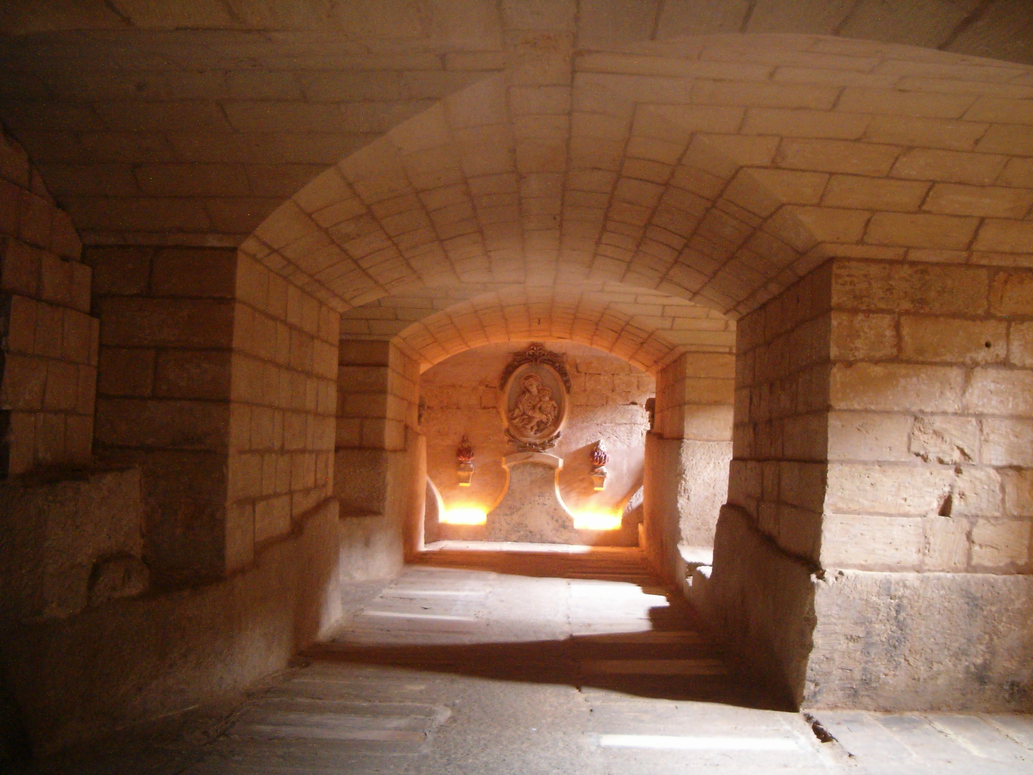 The main crypt known as Il-Mudlama, lies precisely beneath the main aisles stretching between the main entrance to the church to just before the cancel. The crypt is all hewn in rock and roofed over by fifteen arches with stone roof slabs spanning in between. Before the construction of the side naves, the entrance to the crypt was through a flight of steps accessed from a door behind the main entrance, just behind were today there is the niche of St Catherine’s statue.