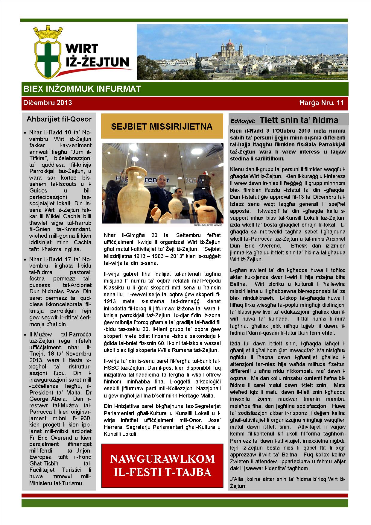 The editorial of this issue looks back at the three years since Wirt iz-Zejtun became active. The main article on the front page highlights the exhibition which was organised by Wirt iz-Zejtun at the HSBC Zejtun branch during Zejt iz-Zejtun last September. Another article on the back page gives an overview on the presentation made by Giulia Privitelli about the research she had conducted on the history of the Zejtun Parish Church.