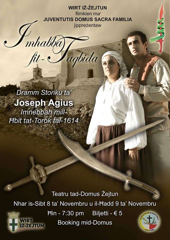 On Saturday 8th and Sunday 9th November at 7:30pm, Wirt iż-Żejtun together with the Juventutis Domus Sacra Familia will be presenting the production “Imħabba fit-Taqbida”. This drama, written and directed by Joseph Agius, takes the form of a fictitious love story occurring in the early 17th century and specifically when the historical event of the Turkish raid of 1614 took place. Most of the characters included in this story refer to real persons who lived at that time and were the key persons who defeated the Turks during their razzia. This production will be held at the theatre of the Juventutis Domus from where one can book his tickets.