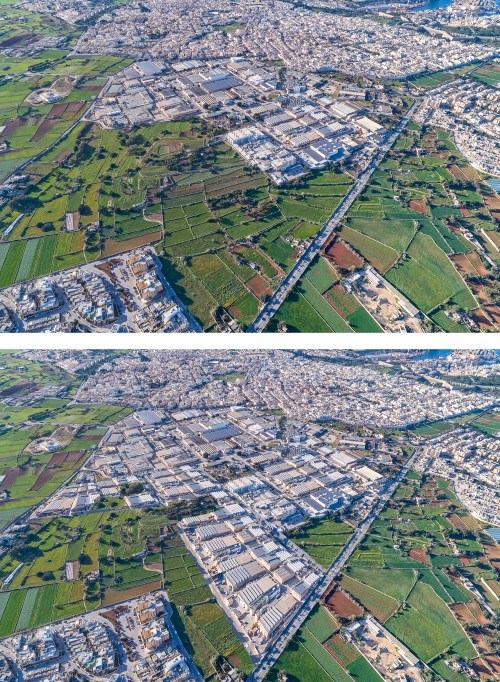 Top: The agricultural land as is today showing the existing industrial area in the centre and Gebel San Martin residential area on the lower left corner. Bottom: Artistic impression of how the area identified in the South Malta Local Plan as a possible extension to the Buleben Industrial Area could look like after being built for industrial use. A cluster from the existing carob trees has been left unbuilt. (Important note – this is an artistic impression produced for Wirt iż-Żejtun since Malta Industrial Parks plans have not been made public yet).