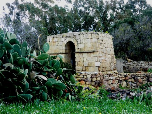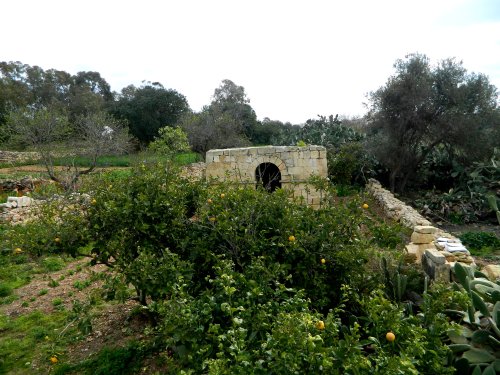 When looking over the wall along Triq il-Merħla onto the fields of It-Taqsis a particular structure drew our immediate attention. At first we thought that we had actually found the lost chapel since the facade of this structure was architecturally similar to that of a small rural church. After getting in touch with the farmer, a closer assessment of this structure was carried out. Although the size of stone and construction methodology used on the facade and outer shell of this building could easily hint a very old structure, the farmer told us that that building was used as a shrine of Our Lady by the previous tenants. The roofing methodology and construction is very interesting, but the internal space is too small for the building as is to be used as a church.