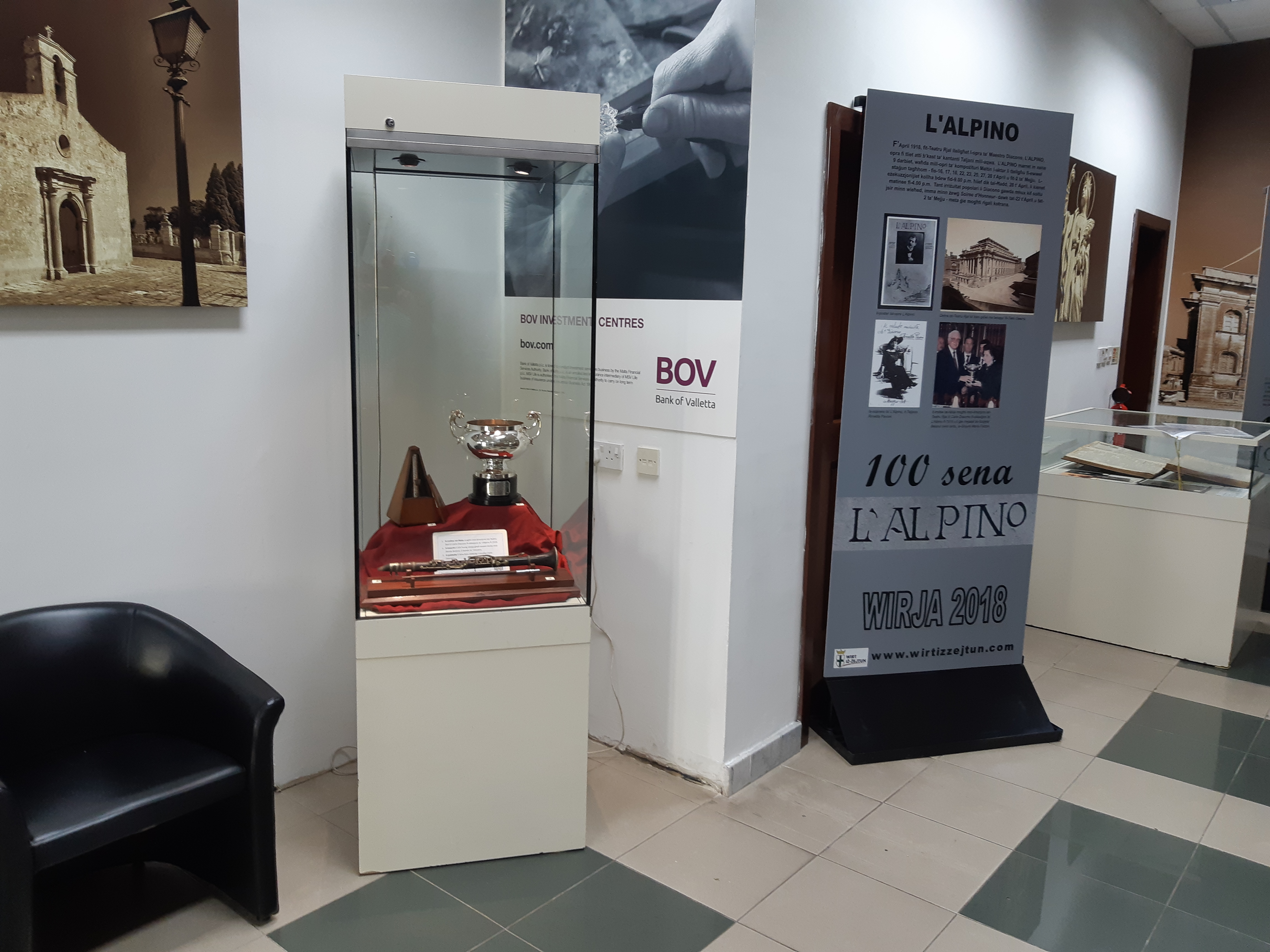 An exhibition was been set up at the Bank of Valletta branch at Żejtun. Thetheme of this year’s exhibition was aimed at commemorating the 100 year anniversary of the first performance of the opera L’ALPINO, composed by Maestro Carlo Diacono.