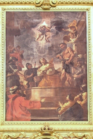 The painting is a copy of another which is of greater artistic value since it is the work of Mattia Preti. Preti’s painting is found at the church of Santa Caterina d’Italia, in Valletta. This painting depicts the saint looking calmly upwards with the executioner drawing out the sword to behead the saint.
